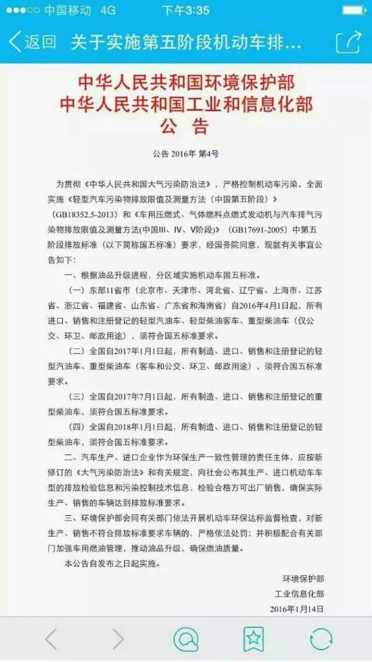 。ㄋ模┤珖2018年1月1日起,所有制造、進(jìn)口、銷售和注冊登記的輕型柴油車,須符合國五標(biāo)準(zhǔn)要求。