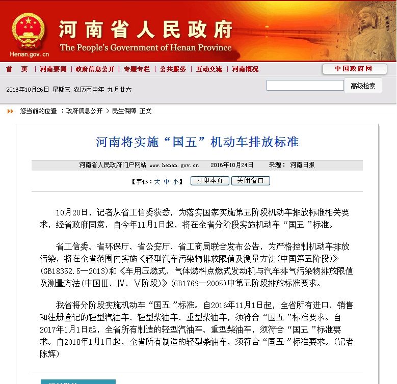 河南省2016年11月1日起將實(shí)施“國(guó)五”機(jī)動(dòng)車排放標(biāo)準(zhǔn)